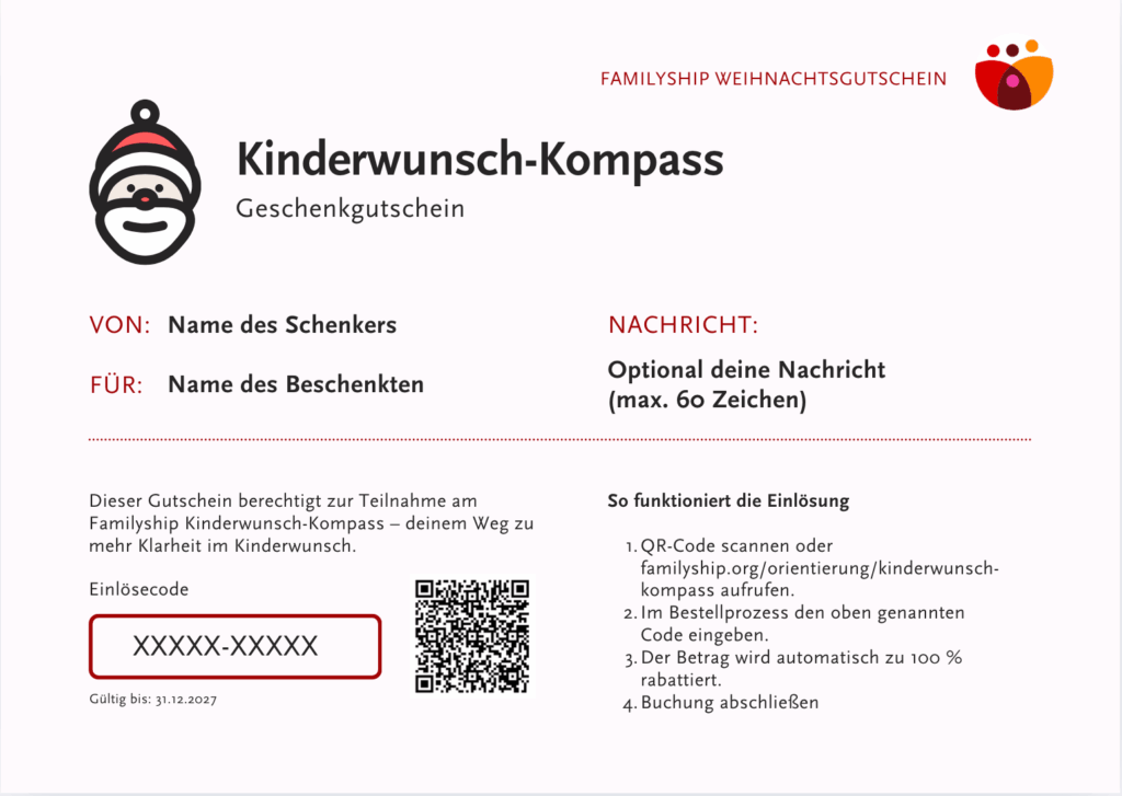 Du überreichst den Gutschein – digital oder ausgedruckt. Die beschenkte Person gibt den Code beim Kauf des Kinderwunsch-Kompasses ein und erhält 100 % Rabatt auf den regulären Preis.